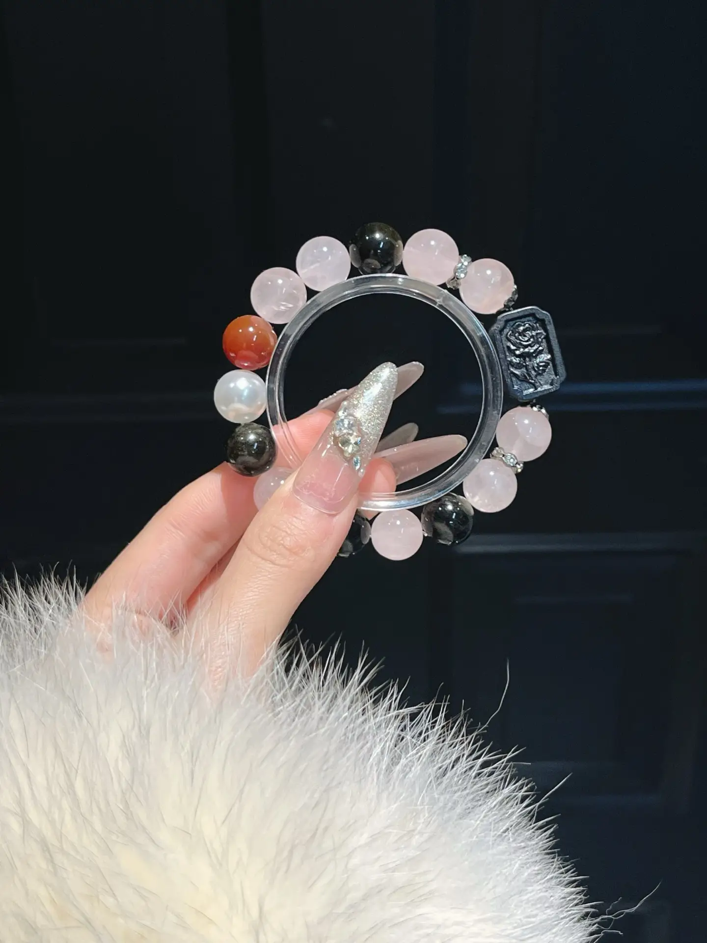 Be the first to review “Powder crystal obsidian, sandalwood, red agate, 12mm”